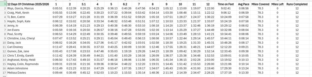 Every year we set the challenge to our members of completing the 12 Days Of Christmas. This is a friendly competition to get members out running over the Christmas period. From Boxing Day until January 6th we run everyday covering 78.3 miles. The distances to be covered are 1 mile, 2 mile, 5k, 4 mile, 5 mile, 10k, 7 mile, 8 mile, 9 mile, 10 mile, 11 mile and 12 mile. One run a day and runs can be completed in any order. Sounds a tough challenge? The distances can be completed individually or as a team of up to 3 members.